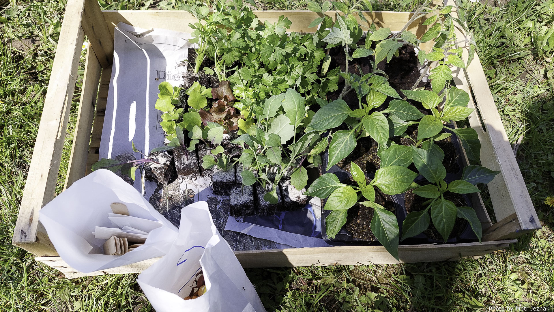 Start / Selbsterntefeld / Tag 1: Die Saisoneröffnung / Die Kiste mit Jungpflanzen und Saatgut.