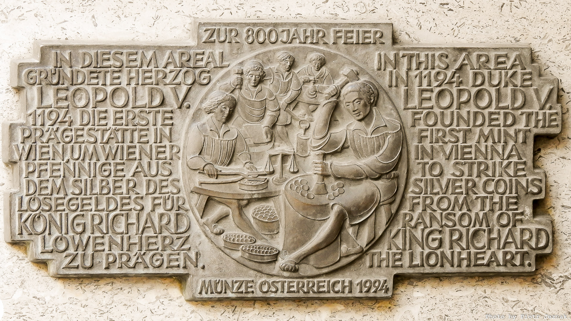 Im Zentrum der Tafel befindet sich eine kreisförmige Szene, die die Arbeit in einer mittelalterlichen Münzwerkstatt zeigt. Oben im Kreis steht ein Hinweis auf das 800-jährige Jubiläum der ersten Wiener Münzstätte im Jahr 1194. Die Information ist zweisprachig: links auf Deutsch, rechts auf Englisch.