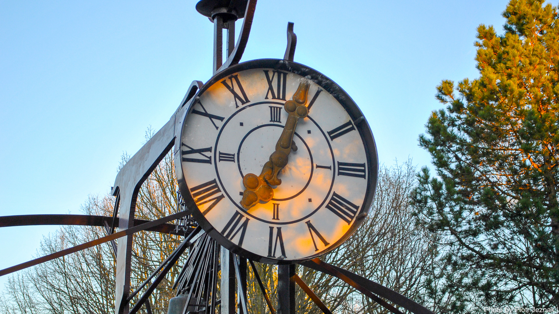 The dial of the clock tower sculpture by Stephan Pral in the Kurpark Oberlaa.