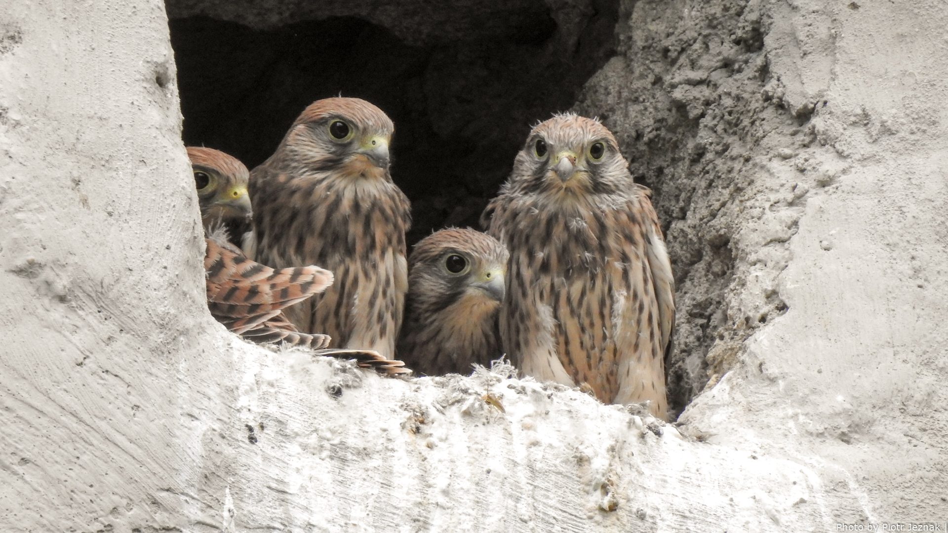 Young Common kestrels on the wall of the Jugendburg Streitwiesen castle.