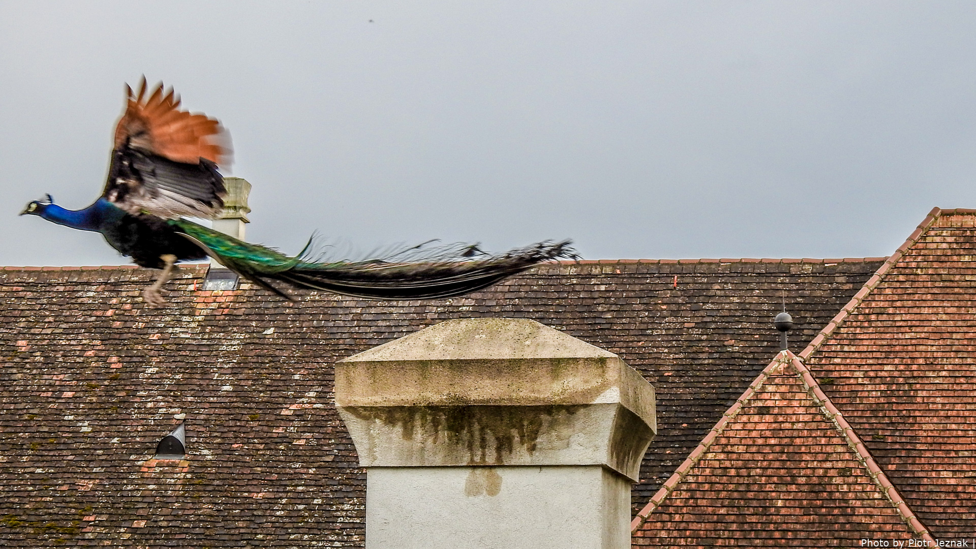 Start / Systematics / Animals / Birds / Pavo cristatus / Indian peafowl (Pavo cristatus) on the flight over Schloss Hof in Lower Austria.