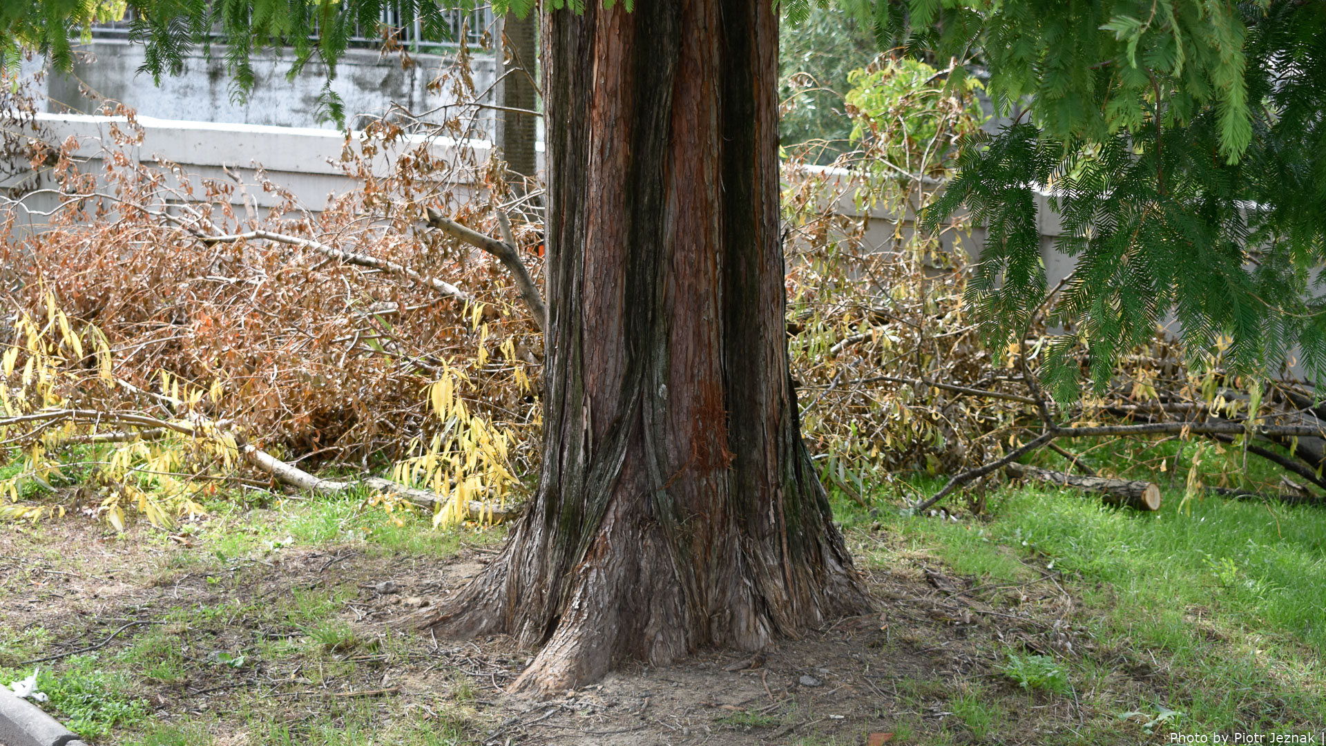 The lower part of the crown of young redwood about 40 meters high in Bielsko-Biała.