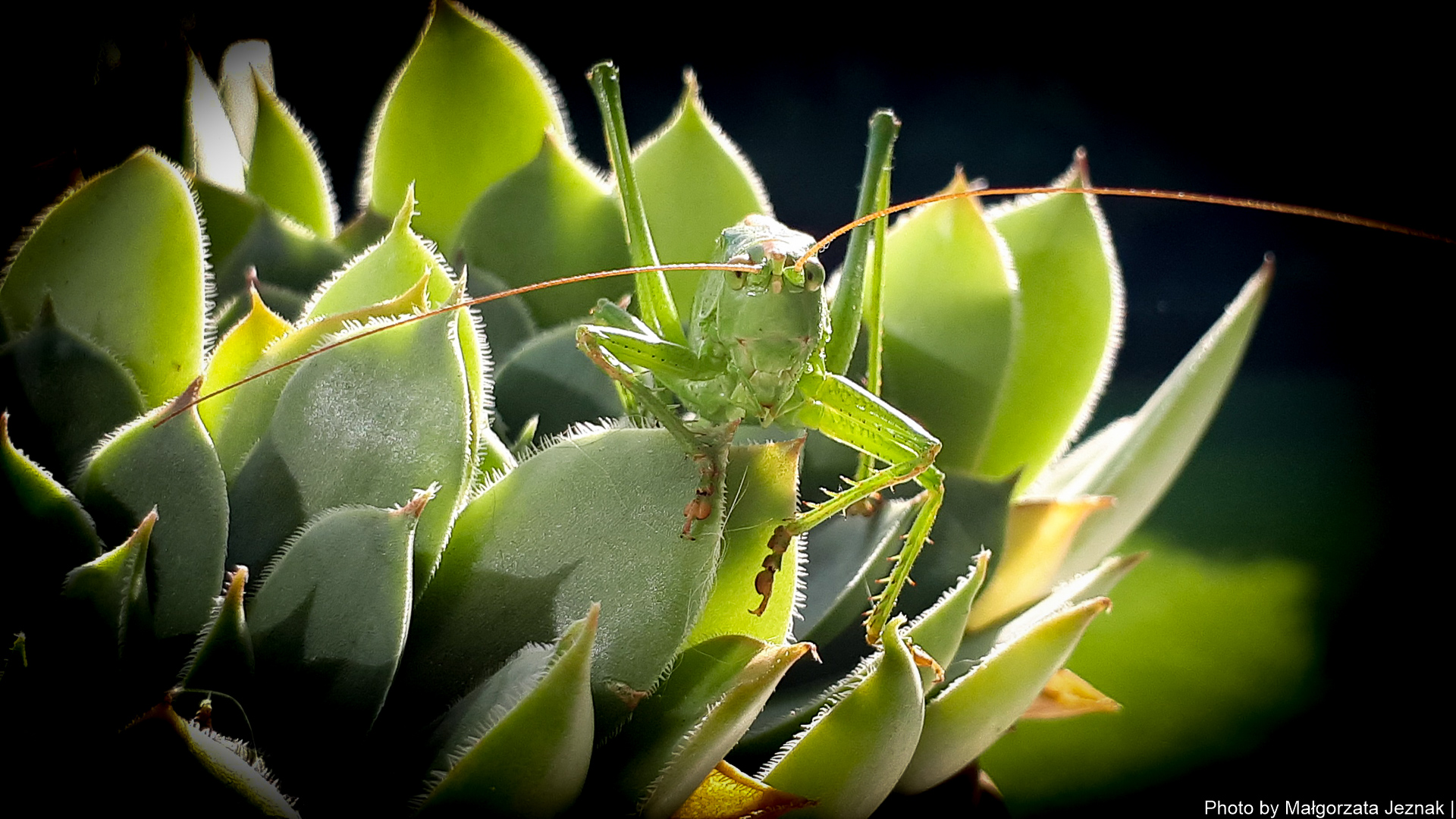 A great green bush-cricket (Tettigonia viridissima) on the leaves of a common houseleek looking into the camera lens.