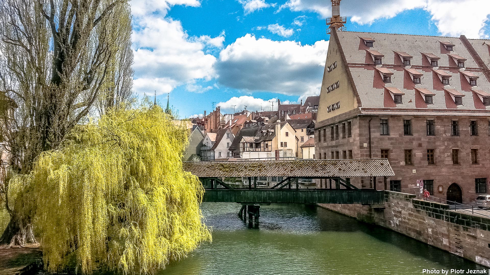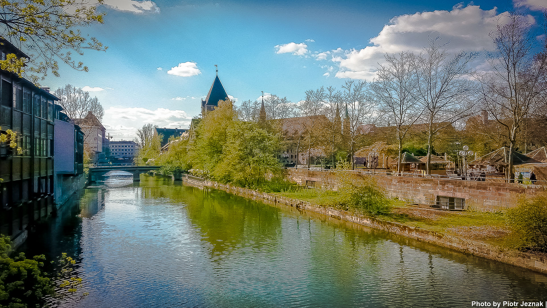 - The Heubrücke over the Pegnitz in Nuremberg. On the right side the Schuldturm (tower).