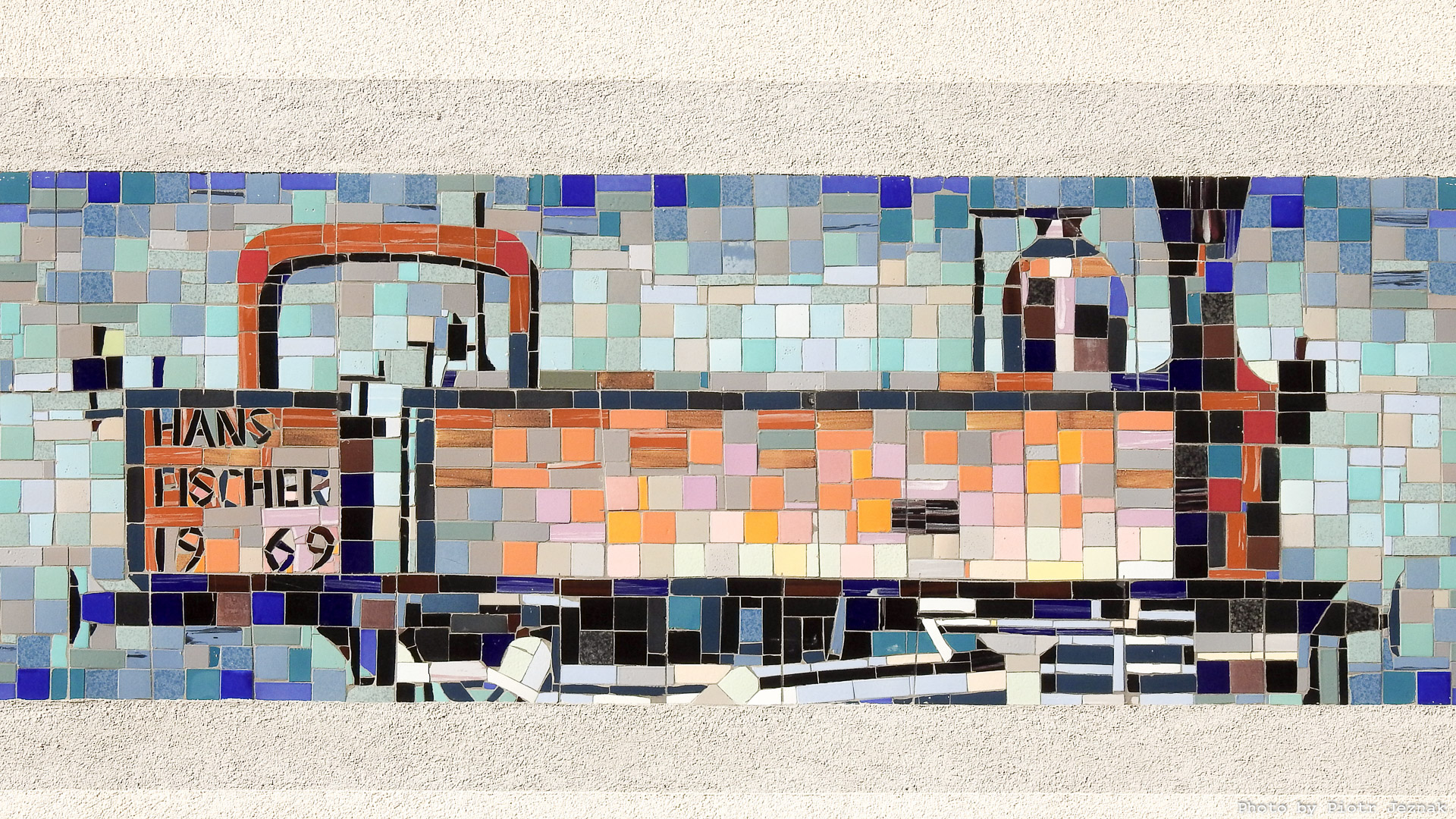 - Part of the mosaic (locomotive) on the building at Aspangstraße 15, 1030 Vienna. Hans Fischer, 1969.