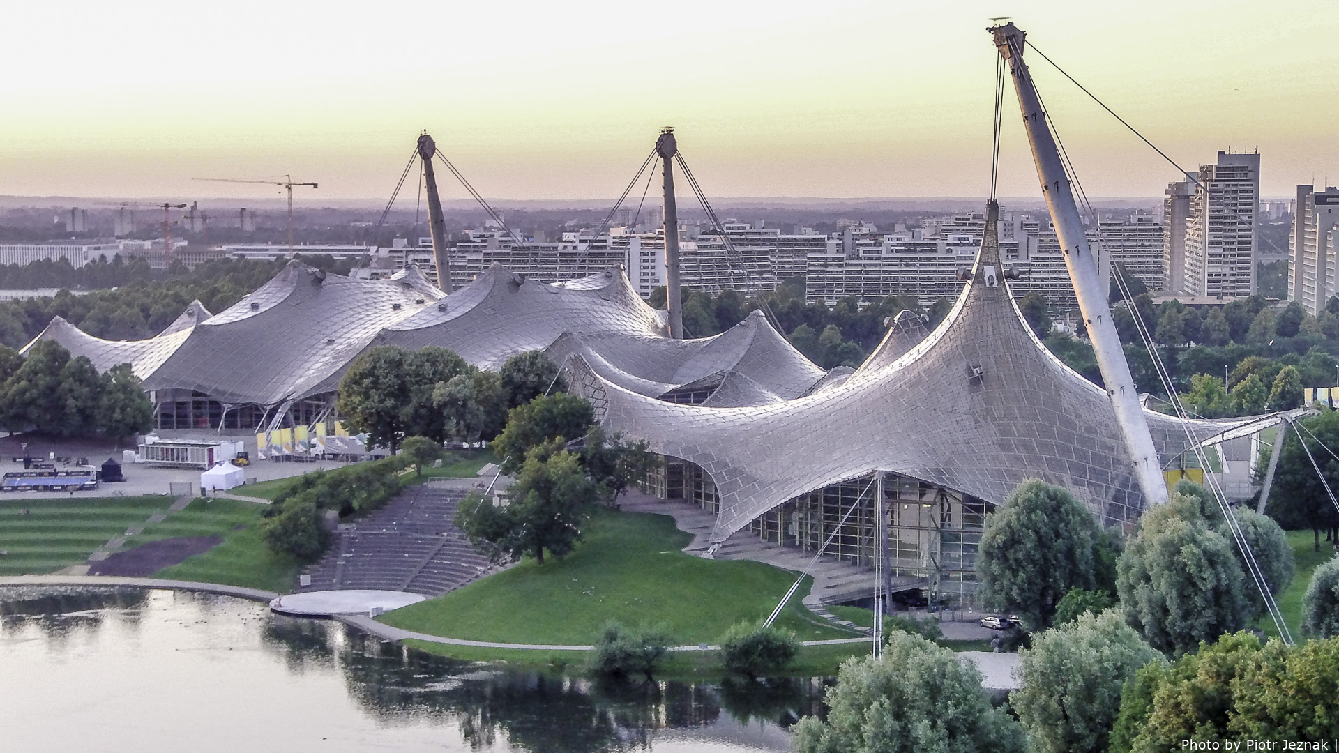 Olympiahalle w Monachium, jako częśc kompleksu architektonicznego z charakterystycznym zadaszeniem z pleksiglasu.